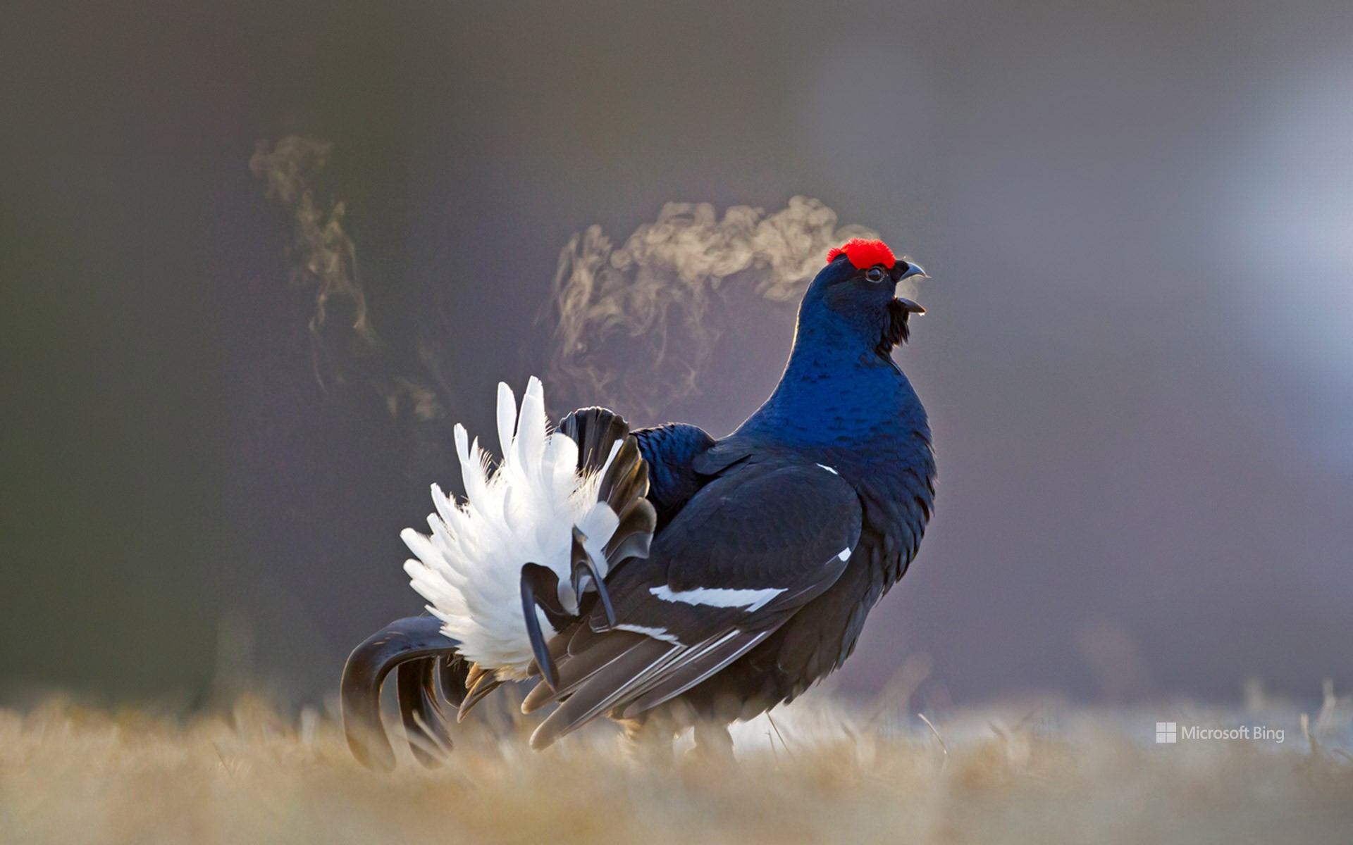 正在打鸣求偶的雄性黑琴鸡,芬兰库萨莫