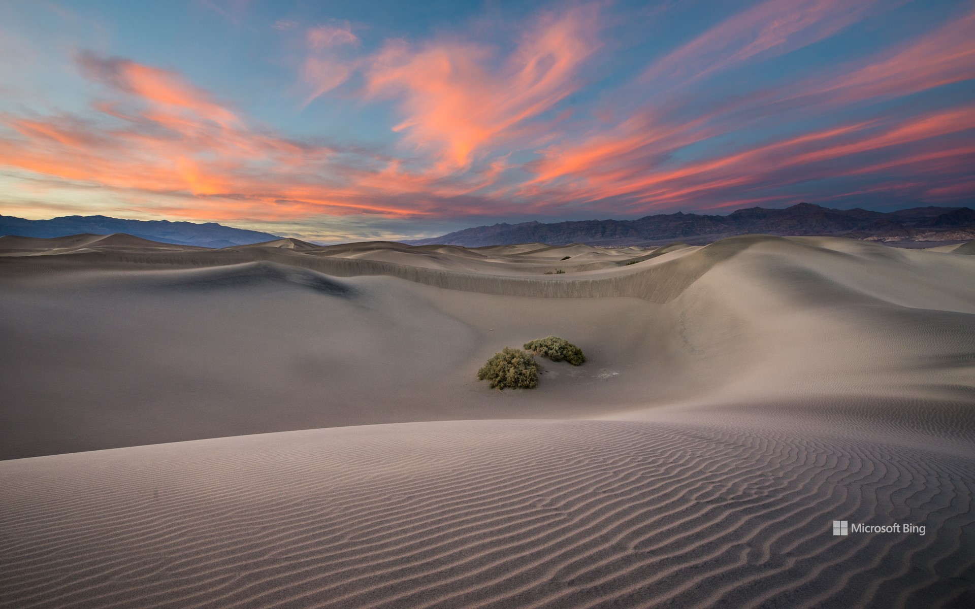 梅斯基特平原沙丘位于死亡谷国家公园内的斯托夫派普韦尔斯村附近,是公园内最易到达且最具标志性的沙丘。它们由北侧山脉风化提供的沙源、盛行风的搬运作用,以及南侧山脉的阻挡所共同作用形成,造就了这片波纹起伏的壮美景观。沙丘以在恶劣环境中依旧顽强生长的蜜荆树命名。在日出和日落时分,沙丘的纹理和棱线在光影映照下格外分明,是欣赏日照美景与星空观测的绝佳地点。